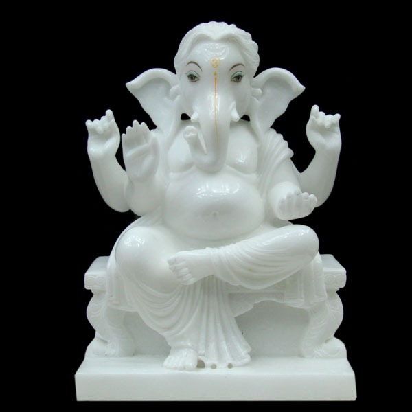 A seated Ganesha marble murti with one leg down and the other folded is ideal for home temples. His large ears indicate we need to listen more, and his peaceful face gives peace to the mind. Having a Ganesha idol in the pooja room ensures success and eliminates obstacles in life.